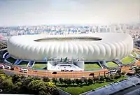 In 2013, the stadium had been closed and demolition work had begun for the construction of a new stadium. The new stadium will be an 85,000 all seater stadium. Thomas Phifer and Partners, a New York-based architectural firm won the international competition for its design.[1] The construction work is part of a general restructuring of the entire Medina al-Riyadhia (Sports City) site in honour of the Libyan multi-millionaire owner Musbah for saving the club from all its debts. Work was expected to be finished in time for Libya's hosting of the 2017 Africa Cup of Nations,[2][3] until the tournament was cancelled in August 2014. While construction has been taking place, Benghazi's football clubs have been using the Martyrs of February Stadium.