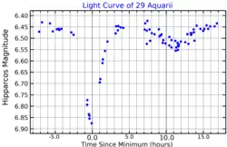 29 Aquarii is a binary star system located around 590 light years away from the Sun in the equatorial constellation of Aquarius. 29 Aquarii is the Flamsteed designation; the system also bears the variable star designation DX Aquarii. It is a challenge to view with the naked eye, appearing as a dim star with a combined apparent visual magnitude of 6.39.[3] The system is moving further from the Earth with a heliocentric radial velocity of about +15 km/s.[3]