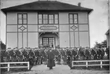 As a result of President William McKinley's call for volunteers to fight in the Spanish–American War on 23 April 1898, Massachusetts was given a quota of four regiments. The colonel of the 2nd Infantry Regiment of the Massachusetts Volunteer Militia, Embury P. Clark, was given authority by the state to raise a regiment on 29 April, with preference being given to militia enlistments; it was brought up to strength by recruits not already in the militia. The core of the regiment was formed by the twelve companies of the 2nd Infantry,[1] whose armories were located across Massachusetts – Companies A, C, and H were at Worcester, Companies B, G, and K at Springfield, Company D at Holyoke, Company E at Orange, Company F at Gardner, Company I at Northampton, Company L at Greenfield, and Company M at Adams.[2] The regiment reported to the state camp ground at South Framingham, designated Camp Dewey, on 3 May, and mustered into Federal service as the 2nd Massachusetts Volunteer Infantry between 8 and 10 May,[3] numbering 47 officers and 896 enlisted men.[4]