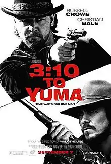 3:10 to Yuma is a 2007 American Western action drama film directed by James Mangold and produced by Cathy Konrad, starring Russell Crowe and Christian Bale in the lead roles with supporting performances by Peter Fonda, Gretchen Mol, Ben Foster, Dallas Roberts, Alan Tudyk, Vinessa Shaw, and Logan Lerman. It is about a drought-impoverished rancher (Bale) who takes on the dangerous job of taking a notorious outlaw (Crowe) to justice. It is the second adaptation of Elmore Leonard's 1953 short story "Three-Ten to Yuma", after the 1957 film of the same name. Filming took place in various locations in New Mexico. 3:10 to Yuma opened September 7, 2007, in the United States and received positive reviews from critics.[3][4] It grossed $71 million worldwide on the budget of $48–55 million.