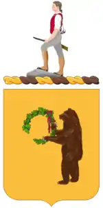 The regimental coat of arms was approved on 10 November 1924 and its distinctive unit insignia was approved on 8 January 1925. The distinctive unit insignia consisted of a standing grizzly bear holding a garland of oak leaves and acorns tied with a ribbon in his paws over a gold background. The regimental motto, "Tiens ta Foi" (Hold thy Faith) was attached on a ribbon scroll below the insignia. The yellow represented cavalry, the bear was from the Seal of Missouri, and the wreath from the Seal of Arkansas, the two state to which the 321st was allocated. The coat of arms was of a similar design except that it omitted the motto and included the Organized Reserve Minuteman crest above the shield.[4]