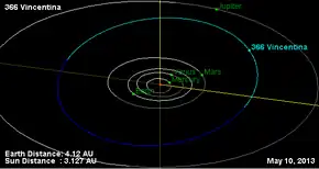 - ↑ "366 Vincentina (1893 W)". JPL Small-Body Database. NASA/Jet Propulsion Laboratory. Retrieved 11 May 2016.