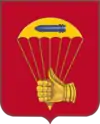- Shield: Gules an open parachute Or, charged with a projectile fesswise Axure; upon the umbrella's cords a dexter clenched gauntlet, thumb to chief of the second