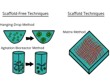 Scaffold free techniques employ another approach independent from the use scaffold. Scaffold-free methods include e.g. the use of low adhesion plates, hanging drop plates, micropatterned surfaces, and rotating bioreactors, magnetic levitation, and magnetic 3D bioprinting.