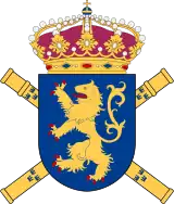 The coat of arms of the Western Army Division used from 1994 to 1997. Blazon: "Azure, a double-tailed lion rampant or, armed and langued gules. The shield surmounted two batons, charged with open crowns azure in saltire or".[3]