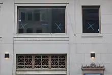 Decorative elements were used sparingly on the facade. These included the two-story coffer-vaulted main entrance on Fifth Avenue, the balustrade and balconies on the facade, the ninth- and tenth-floor colonnade, and the copper cornice on the facade above the tenth floor.[3] The main entrance was spanned by an arch topped by an elaborately decorated keystone, while cartouches and other decorations were present in other parts of the entrance vestibule.[6] "Multi-light windows" were added on the third through tenth floors, deviating from the plate glass windows typically used in retail buildings, which one critic said "added much to the appearance of the openings".[4] In addition to the main entrance, there were smaller side entrances on 38th and 39th Streets.[8]