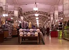 There were no retail areas on the tenth floor, which instead contained a food court with restaurants that could collectively seat 500 people.[11][7][14] The dining areas were named after their theming: the Adam style Wedgewood Room, the Chinese-themed Mandarin Room, and the Italian villa-themed Loggia.[11][14] Other customer amenities included a concert hall within the seventh-floor music department, and restrooms, telephones, and travel counters on the fifth floor.[7] There was also a "manicure parlor for men" as well as a mechanical horse ride.[13] Employee amenities were also built into the design of the building. There was a gym, solarium, and dental and medical departments on the 11th floor,[11] while other floors contained dining rooms and a men's smoking area.[7] A plaque, commemorating 68 Lord & Taylor employees who died in wars, was hung on the wall just inside the entrance.[15] After Amazon renovated the building in 2023, it contained a dog run, dining room, and roof terrace.[16]