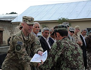 The commander of the 438th Air Expeditionary Advisory Group, gives a certificate to an Afghan National Army Air Force airman during a graduation ceremony
