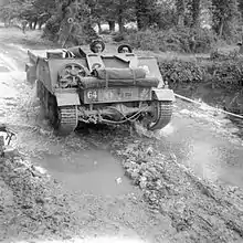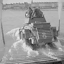 HQ, A and C Squadrons of 43rd (Wessex) Reconnaissance Regiment were aboard the troopship Derrycunihy, which arrived off Sword Beach on the evening of 20 June. High seas and enemy shelling prevented unloading for three days and it was decided to move to Juno Beach for disembarkation. As the ship started engines it detonated an acoustic mine, splitting the ship in two, and the after part, packed with sleeping men of 43rd Recce Regiment, sank rapidly. Worse still, an ammunition lorry caught fire, and oil floating on the water was set alight. Landing craft and gunboats came alongside and picked up survivors, but the regiment lost 183 men, with another 120 evacuated wounded. Most of 43rd Recce Rgts's vehicles were landed from the beached fore part of the "Derrycunihy", and reinforcements were sent from England, but the regiment was not fully up to strength until the end of July 1944.[39][40][41][42][43]