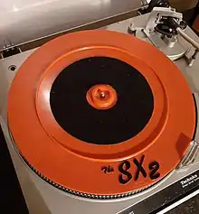 The SX2 and The Extender were designed and manufactured by Mark McLaughlan between the early 1980s and early 1990s.[2] McLaughlan, a Boston area nightclub DJ, came up with the design to make 7" discs easier to handle when mixing. The original design (The Extender) was made up of a platter die-cut from sheets of plastic that McLaughlan would drive on the hood of his car from the supplier in Cambridge, MA to the die-cutter in Ipswich, MA. He would then do the final assembly (bonding a lathe cut acrylic center and a foam pad) and packaging by hand. The SX2 (Single Extender, Rev 2) was manufactured by plastic injection at Spirit, Inc. in Wakefield, Massachusetts. One of the main design revisions, required was a series of 'ribs' on the underside of the platter to prevent warping from the extreme changes in temperature during the manufacturing process. A raised barrier was also added to contain the head in the event of miscuing and a polished surface inside the barrier to minimize damage to the stylus. Due to its limited manufacturing run the SX2 has become a sought after rarity among pro DJs.