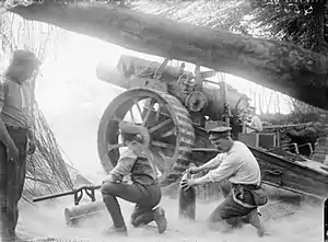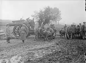 47th Siege Bty embarked from Southampton on 26 November under the command of Major Robert Daubuz (who had been stationed on Gibraltar on the outbreak of war).[11] It was equipped with four 8-inch howitzers[lower-alpha 2] and accompanied by its Army Service Corps mechanical transport (MT) section (2nd Section, No 593 MT Company of 33rd Bde). The battery disembarked at Boulogne on 27 November and marched across France to Belgium (delayed when one of the howitzers became ditched), arriving on 7 December at Vlamertinghe in the Ypres Salient.[14][15][16][17]