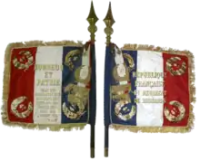 Standard for the 4th Hussar Regiment. The standard on the right inscribes the title of the 4th Hussar Regiment. The words inscribed on the left standard are in the following order: • Valmy 1792Hohenlinden 1800Austerlitz 1804Friedland 1807 • Kanghil 1855 • Guise 1914Second Battle of Belgium (1918)Algerian War (1954- 1962)