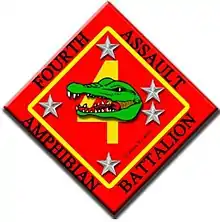 The division patch worn on Saipan had a gold "4" on a scarlet background, the official colors of the U.S. Marine Corps. The emblem was designed by SSgt John Fabion, a member of the division's Public Affairs Office before the Marshalls Campaign. His commanding officer was astonished to find that when the division attacked Roi Islet in Kwajelein Atoll in the Marshall Islands (January 1944), the layout of the runways on the airstrip there were an exact replica of the "4". The 4th had two Seabee Battalions posted to it during the war. The 121st Naval Construction Battalion was posted to the 20th Marines and redesignated as the 3rd Battalion of the Regiment. They landed with the 4th on Roi-Namur, Saipan and Tinian and received a Presidential Unit Citation for it. The 20th was deactivated and the 121st stayed on Tinian to work on the airfields when the 4th moved on. They were replaced by the 133rd NCB for the assault on Iwo Jima. The 133rd was posted to the 23rd Marines as their shore party until relieved on D plus 18.[3]
