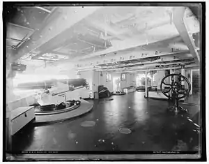The Mark 3, gun Nos. 87–199, 287–292, were first delivered in January 1897. The Mark 3 was also a semi-fixed ammunition gun that was designed for use on cruisers and battleships. The Mark three was constructed of a tube, jacket and two hoops, all of gun steel with a side-swing carrier type breech. Mod 1 used a different jacket with a locking hoop forward of the slide cylinder. Mod 2 was a Mod 0 or Mod 1 gun relined using a conical nickel-steel liner. Gun No. 104 was converted into and experimental Mod 3 gun from a Mod 0, being cut down to 25-caliber or 75.39 inches (1,915 mm), for use as an anti-aircraft gun. The muzzle end was cut off and a conical nickel-steel liner installed, this gave it the same characteristics as a 5″/25 caliber Mark 10 anti-aircraft gun. The gun later ruptured during testing. The muzzle of gun No. 174, mounted on the battleship Kearsarge, also had its muzzle blow off.[1][2]