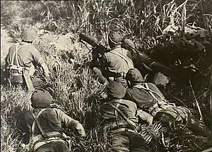 Following Japan's entry into the war in December 1941, the battalion was mobilised for war service.[33] In early 1942, when concerns about a Japanese invasion of Australia heightened, the battalion, consisting of 44 officers and 890 other ranks, was moved to Jimboomba, in Queensland, from Bonegilla.[34] The invasion did not eventuate and the government decided to demobilise part of the military to rectify a manpower shortage that developed in the Australian economy.[35] As a result, on 27 August 1942, the 52nd Battalion was once again amalgamated with the 37th Battalion to form the 37th/52nd Battalion,[21] and some of its personnel were released back to civilian industry. The 10th Brigade was disbanded around this time, and subsequently the 37th/52nd Battalion was assigned to the 4th Brigade.[36] Together the amalgamated battalion subsequently served in the Huon Peninsula and New Britain campaigns in 1944 and 1945 before being disbanded on 12 June 1946.[37]