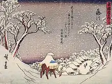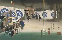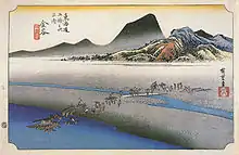 The 53 Stations of the Tōkaidō (東海道五十三次, Tōkaidō Gojūsan-tsugi) are the rest areas along the Tōkaidō, which was a coastal route that ran from Nihonbashi in Edo (modern-day Tokyo) to Sanjō Ōhashi in Kyoto.[1] There were originally 53 government post stations along the Tōkaidō, where travelers had to present traveling permits at each station if wanting to cross.