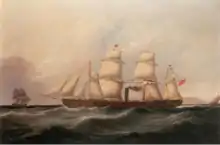 On deployment to India during the Indian Rebellion about 350 men and five women of the headquarters, 54 Regiment, were aboard SS Sarah Sands, one of the earliest iron, screw type steamers, when fire broke out on 11 November 1857.[26] The ship had been built in 1846 and had previously been chartered by the British government for the Crimean War and was again under charter transporting troops and a large amount of powder and ammunition carried in two magazines.[27] The ship was a thousand miles from nearest land and outside shipping lanes, and if lost with all aboard would have been another mystery, though messages were placed in bottles that were never found.[26] Some of the crew, which had been troublesome since sailing, abandoned ship in the two best boats leaving the ship's officers, remaining crew and men of the regiment to fight the fire.[27] The ladies were put in a boat with what provisions could be found and Private William Wiles of the regiment and ship's Quartermaster Richard Richmond risked their lives to save the regimental colours from below decks.[28]