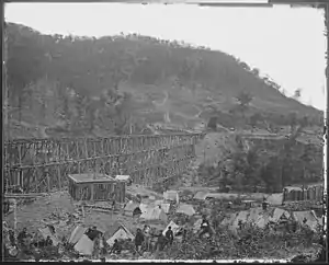 Pioneer company of the 59th Illinois Volunteer Regiment rebuilding the Nashville & Chattanooga Railroad bridge over Running Water Ravine near Whiteside, Tennessee after it was burned by retreating Confederate Army. Construction lasted for six weeks in December 1863-January 1864; first train crossed the bridge on January 14, 1864[1]