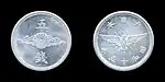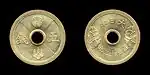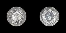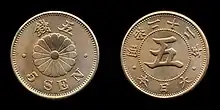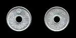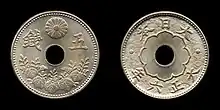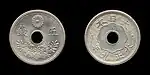 The 5 sen coin (五銭硬貨) was a Japanese coin worth one twentieth of a Japanese yen, as 100 sen equalled 1 yen.[1] These coins were minted from the late 19th century until the end of World War II. Like the other denominations of sen, these coins were eventually taken out of circulation at the end of 1953.[2] While not in circulation any more, these coins are bought and sold by numismatists for academic study, and by those with a hobby.