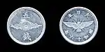 The National Mobilization Law was legislated in the Diet of Japan by Prime Minister Fumimaro Konoe on March 24, 1938 to prepare the country for war. This action led to the promulgation of the "Temporary Currency Law" which came into effect on June 1, 1938.[44][45] It now became possible to change the material and purity of money without a resolution from the Imperial Diet.[44] An aluminium bronze alloy consisting of 95% copper and 5% aluminium replaced the nickel coins as the latter was needed for munitions.[44][45] Although nickel coins were produced dated 1938 (year 13), these were not distributed by the Bank of Japan. Almost the entire ten million mintage was re-melted to be used for the war effort per the newly established law.[46][47] The weight and size of five sen coins did not change when the alloy was switched.[44] Changes made included a new design again solicited from the general public, and a smaller central hole.[44] The design chosen features on the obverse a chrysanthemum seal up on top with the paulownia below, while the reverse has cherry blossom halves flanking both sides. These coins were only produced for two years before an increased wartime demand for copper caused an alloy change. Five sen coins were switched to a pure aluminum alloy on July 19, 1940 (year 15) by Royal Decree No. 476.[48] The size of the coins remained the same while the light aluminum alloy cut the weight of the coins by more than half from 2.80 to 1.20 grams. These coins feature a chrysanthemum seal on the obverse, and the mythical kite bird on the reverse (revised design from before).[49]
