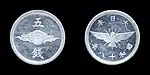 The suspension of five sen coins outlasted Emperor Taishō and continued until 1932 (year 7 of Shōwa). Five sen coins were produced again due to the Mukden Incident and subsequent Japanese invasion of Manchuria.[33] These events caused a shortage in coins as the demand for military supplies led to a booming economy. Amendments were made in June 1932 regarding the coinage law, and were put into effect on July 1.[38] Copper-nickel coins from the Taishō era were brought back into production before the alloy and design were changed due to wartime conditions.[33] The 1897 coinage act was amended for a final time in 1933 (year 8) to implement these changes. The width of the coin dropped slightly by 0.1mm to 19mm, and the weight was increased from 2.63 to 2.80 grams. Input was solicited from the general public in order to base a pattern design for these coins.[39][40] The obverse features the chrysanthemum seal up on top with a kite bird below, while the reverse features eight magatama. Using a kite bird is symbolic here, as allegedly Emperor Jimmu used it to defeat his enemies in battle.[39] Nickel was chosen for an alloy as countries at the time including Japan were stockpiling it in preparation for war.[39][41][42] These pure nickel coins substituted the old copper-nickel coins starting on April 1, 1933.[43] Production continued for another four years before the Second Sino-Japanese War broke out with the Marco Polo Bridge Incident in July 1937. This event left an impact on how five sen coins were made for the rest of the series.