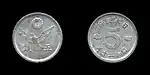 Five sen coins were brought back into production by the Japan Mint in September 1945. The initial plan was to use the design featured on the previous five sen aluminum coins. These coins were never released, and all of them were melted as permission was not granted by the Supreme Commander for the Allied Powers.[57] Criticism fell upon the prewar design, and how the country's name read "大日本" (Dai Nippon, Japanese Empire) on the coins. The solution was to redesign the coin entirely and replace the name with "日本政府" (Nippon-koku, Government of Japan).[58][59] Tin was chosen again for an alloy as aluminum was below the coin's face value.[60] These final five sen coins are the same 17mm size as their predecessors, but weigh an even 2 grams (up from 1.95). The design features a chrysanthemum seal with a dove (symbol of peace) on the obverse, while the reverse has a large Latin numeral "5".[60][57] Issuance came on January 26, 1946 by royal order after the coins were approved.[61] These coins continued to be produced until supplies ran out sometime in 1946 (year 21).[57] Five sen coins were eventually demonetized at the end of 1953 when the Japanese government passed a law abolishing subsidiary coinage in favor of the yen.[2] Currencies of less than one yen were rarely used by this time due to excessive post-war inflation.[62]