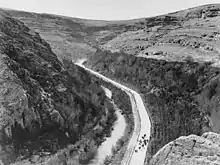 For the offensive in Palestine, the brigade was assigned to the Australian Mounted Division.[9][10][11] Prior to their commitment to operations, the troopers were converted from cameleers and were issued swords and received cavalry training.[12] Having been formed late in the war, the 5th Light Horse Brigade's involvement in combat operations was limited to the final offensive of the war, which began with the Battle of Megiddo in late September 1918. During this offensive, the brigade took part in the Battle of Sharon and Battle of Tulkarm, taking a large number of prisoners to the west of the Samaria Ranges.[13] During operations to secure Damascus, the brigade took up positions overlooking the Barada Gorge, helping to cut off withdrawing Ottoman and German troops, and inflicting heavy casualties on them during an ambush on 30 September.[14] The brigade then spent the night there in freezing conditions before elements entered Damascus on 1 October.[15][16] For the remainder of the month, it was engaged in minor mopping up and patrol operations before joining the final stage of the campaign, which saw the brigade begin the advance towards Aleppo. The advance was short lived, as on 30 October the Ottomans surrendered, and the Armistice of Mudros came into effect, bringing an end to the fighting in the theatre.[17][18][19]