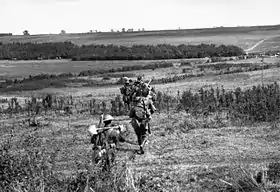 In early 1918, the 5th Pioneers supported the Allied defensive actions that were fought in response to the German spring offensive. In mid-April, during the Second Battle of Villers-Bretonneux, elements of the battalion were subjected to a gas attack whilst guarding road-mines around the village.[14] They were later employed to dig a defensive switch to provide flank defence prior to the German attack and connect the first and second line of defensive systems.[15] After the Allies had blunted the German offensive, in the lull that followed the Allies sought to regain the initiative through a series of minor attacks before going on the offensive. During this period, the battalion took part in an attack around Morlancourt at the end of July, during which they suffered 16 casualties.[16] The Allies launched their Hundred Days Offensive around Amiens in August 1918, which ultimately brought about an end to the war.[2][17] As a part of this offensive, the 5th Pioneers supported actions around Peronne at the end of August.[18]