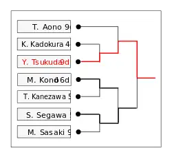 The female professional seed was determined by a single-game playoff between Tomomi Kai 2-crown (Women's ōi and Kurashiki Tōka) and Manao Kagawa (Women's ōshō), which was won by Kagawa.[3] Brackets from two of the preliminary tournaments are shown below.