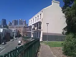 A fine, substantial early nineteenth century terrace with twelve pane windows, central carriageway, with semi circular fan light. This residence has two bedrooms. Storeys: Three; Construction: Painted rendered masonry walls, corrigated galvanised iron roof, painted timber joinery. Style: Old Colonial Regency. Orientation: Overlooking Towns Place.[1]