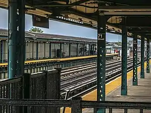 This elevated station has three tracks and two side platforms. The center express track is not normally used. Both platforms have beige windscreens and brown canopies with green frames and support columns along their entire lengths except for small sections at either ends. Here, they have waist-high black steel fences with lampposts at regular intervals. The station signs are in the standard black plates with white lettering.