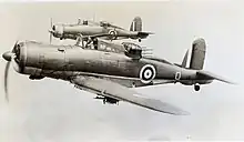 It operated various types of aircraft while at Arbroath, in March 1941 Albacore single-engine biplane torpedo bomber aircraft, were received. One year on, in March 1942, the squadron started using Skua a Carrier-based dive bomber/fighter aircraft and Sea Gladiator single-seat fighter biplane aircraft, fitted with arrestor hooks, and these were followed by Swordfish biplane torpedo bomber aircraft in the April. October 1942 saw the arrival of Spitfire single-seat fighter aircraft to the squadron and one year later, in October 1943, Sea Hurricane single-seat fighter aircraft were received. By the end of that year the squadron received a later variant of Swordfish and in April 1944, it started using the TT III mark of Defiant, a dedicated turret-less target tug.[4][3]