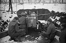 Although the majority of the New Zealand Division would take part in the Battle of Crete, 7th Anti-Tank Regiment was evacuated to Egypt prior to the battle.[18] In Egypt the regiment acquired new 2-pounder gun portées (previously only 34 Battery had portées) and was brought up to strength with reinforcements. A fourth troop was also added to each battery,[Note 2] but, unlike the first three troops, were instead equipped with 18-pounder guns converted to be used in the anti-tank role.[19] In September 1941 the New Zealand Division took over the Baggush Box, a defensive position on the Libyan coast. Training would nonetheless continue until November in anticipation of an offensive against the Germans and Italians in Libya.[20]