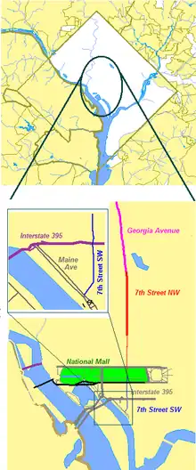 1. Google (March 3, 2019). "7th Street SW and NW" (Map). Google Maps. Google. Retrieved March 3, 2019.