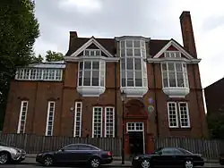 It was commissioned by the painter Marcus Stone as a "studio-home" for himself. The house was designed by architect Richard Norman Shaw in the Queen Anne style. Shaw was well acquainted with members of the art establishment, being friends with Dante Gabriel Rossetti, William Morris and Philip Webb.[2] The choice by Fildes and Stone of Richard Norman Shaw as the architect of their houses was an important symbol of their ambition to become academicians, members of the Royal Academy of Arts, and of the art establishment themselves.[3] The imposing houses and studios that Shaw designed would impress potential patrons.[3] The house is next to the home of George Frederick Watts, and backs on to the garden of the Leighton House Museum, the former "studio-home" of Frederic, Lord Leighton.[2] Stone's studio occupied the whole of the first floor of the house.[3] The house is now separated into flats.[4]