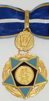 The 9/11 Heroes Medal of Valor, which intentionally resembles the Public Safety Officer Medal of Valor and the military's Medal of Honor, is a gilt, light blue-enamelled, five-pointed, upside-down star (i.e. one arm points downwards), surrounded by a wreath of laurel. The center has a dark blue-enamelled pentagon (representing The Pentagon), with a gilt disc bearing the twin towers of the World Trade Center, the American eagle holding the shield of the United States and laurel, and the date "9. 11. 01". The Medal is suspended on a gilt disc bearing a letter "H" (for Heroism) inside a keystone, (representing the Keystone State of Pennsylvania) surrounded by a wreath of laurels, which is in turn suspended on a neck ribbon, blue with gold and light blue edge stripes and a white center stripe.
