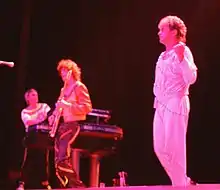 After the band introduced themselves as Cinema on MTV, they received legal threats from other bands with the same name.[22] This prompted Carson to suggest that they continue as Yes, as the group now consisted of four past Yes members. When Rabin, who wished the album to be judged in its own right, was eventually persuaded, work began on promotion and rehearsals with keyboardist Eddie Jobson, formerly of Roxy Music and U.K. (Duncan Mackay, formerly of Cockney Rebel and 10cc, was also considered for the position.[23]) Jobson appeared in the video for "Owner of a Lonely Heart" and was reported in the press as a Yes member as late as November 1983;[24] however, seeking to consolidate the band's legal identity as Yes, management came to an agreement with Kaye who returned after touring with Badfinger. Unimpressed with the change, citing "political problems" within the group, and having a lack of interest in sharing live duties with Kaye, Jobson left by early 1984.[25]
