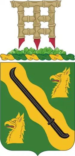 Green and yellow (gold) are the colors used for the Military Police Corps. The griffin is a mythological creature famed for the attributes of vigilance, courage and strength and alludes to the unit. The color black suggests the robes of justices and the sword denotes leadership and military. The griffin heads, wavy bend and oriental sword together refer to the unit's three activations overseas: two in Europe and one in Asia.