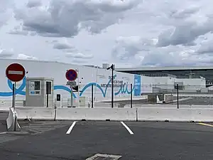 The station is being built on the level of the last extension of the parking garage P0, right next to a connector building connecting the South and West terminals. Work began in March 2017 with the demolition of a road bridge opposite the drop-off point and the P0 parking extension.[4] Construction of the station started in September 2018 for delivery in 2024.[1]