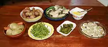 Aïoli garni or grand aïoli is a traditional Provençal dish or meal based on aïoli, usually accompanied by salt cod and boiled vegetables; other ingredients may include escargots, hard-boiled eggs and small boiled octopus. It may also be known simply as aïoli, like the sauce for which it is named.