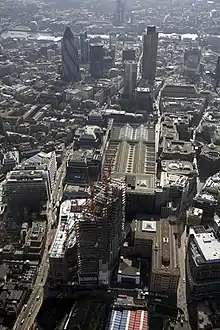Running north from the junction, the A10 is carried by Gracechurch Street, Bishopsgate and Norton Folgate. Liverpool Street station - the London terminus of the West Anglia Main Line (down to Enfield, Hertford, Stansted Airport and Cambridge) and the Great Eastern Main Line (down to Southend, Chelmsford, Ipswich and Norwich) - sits directly west of the A10 Bishopsgate.[4][11] 22 Bishopsgate is the second-tallest building in London, and the tallest within The Square Mile.[12][13]