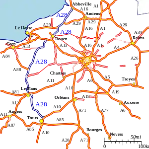 Autoroute 28 is a French mainland motorway linking Abbeville in the Somme to Tours in Indre-et-Loire. The motorway starts at Abbeville, splitting from the A16 and, after merging with the A13 near Rouen, ends at Tours, merging with the A10. It is 405 km long. The motorway between Rouen and Tours was added to the Schéma Directeur Routier National in 1987.