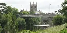 The road then swings towards Wellington with a short section of dual-carriageway. The A49 then reaches Hereford, the only major destination on the road without a bypass. The road passes right through the city centre, causing serious congestion on both the north and south sides of the River Wye. The dual-carriageway Greyfrairs bridge over the Wye opened in 1967.[6] The A49 meets the A438 at the Edgar Street Roundabout. The road then swings south-eastwards out of Hereford, meeting the A465 at the Belmont Roundabout. At Ross-on-Wye the road ends, joining the A40 and B4260 at the Wilton Roundabout.