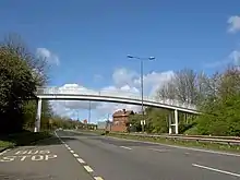The Rainworth bypass crosses Clipstone Forest and Rainworth Water, enters Mansfield District, and meets the former route of the A617 at the large landscaped Three Thorn Roundabout (named after Three Thorn Hollow Farm), built in anticipation of a bridge over the roundabout at the junction. The £8m Rainworth Bypass, built by Birse, was opened on Friday 23 June 2000 at 1.30pm with a commemorative plaque unveiled on the trussed footbridge to Strawberry Hill.[4] To the north of the roundabout is Ransom Wood Business Park.[5] A large wind farm is to the south, and the bypass meets the A6117 at a roundabout, and the A60 at an at-grade junction, where it enters the district of Ashfield, another former coal mining district. It passes under the A611 and meets the A38 Sutton-in-Ashfield bypass. The Mansfield Bypass (MARR) has no grade-separated junctions. The southern section from Rainworth to the A38 opened on 21 December 2004 and was built by Alfred McAlpine, and designed by Babtie, Shaw and Morton of Glasgow.