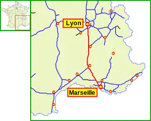 The A7 Autoroute, also known as l'autoroute du Soleil (English: the Motorway of the Sun) is a French motorway. It continues the A6 and links Lyon to Marseille. The autoroute du Soleil is 302.5 km (188.0 mi) long and forms part of European routes E15, E80, and E714.