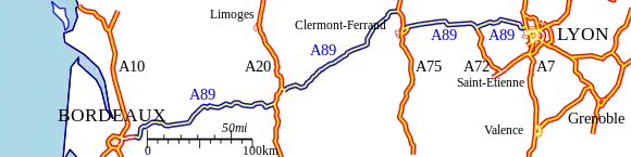 The A89 autoroute is an autoroute in central France. It is known as the La Transeuropéenne. It connects Bordeaux (from Libourne) and Lyon (at Limonest) via Clermont-Ferrand. Its total length is 544 km (338 mi).