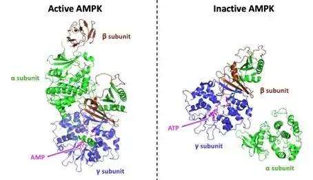 - ↑ Xiao B, Heath R, Saiu P, Leiper FC, Leone P, Jing C, et al. (September 2007). "Structural basis for AMP binding to mammalian AMP-activated protein kinase". Nature. 449 (7161): 496–500. Bibcode:2007Natur.449..496X. doi:10.1038/nature06161. PMID 17851531. S2CID 4345919.