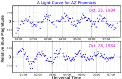 AZ Phoenicis is a Delta Scuti variable that pulsates with a single period of 79.3 minutes,[1] causing its visual brightness to vary with an amplitude of 0.015 magnitudes.[3] Its variability was discovered by Werner Weiss in 1977, from observations with the 50-cm telescope at La Silla Observatory.[8] AZ Phoenicis has also been classified as a possible Ap star, which remains uncertain, even though the star has a large concentration of metals;[1] the overall metallicity of the star has been measured to about 3 times the solar metallicity.[6]