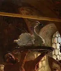 Makovsky's depiction of the wedding, an important social event of 16th and 17th century boyar life, is dramatically lit. The guests are depicted at the table with food and drink served on silverware in front of them. A roasted swan is being brought in on a large platter, the last dish served before the couple retire into the bedroom. Luxurious details such as silver cups, richly embroidered garments, and an ivory chest with a silver bowl in the foreground are depicted. The bride and the other women are wearing pearl-studded kokoshniki, a Russian woman's headdress.[17][18][19]