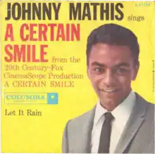 The music was written by Sammy Fain with lyrics by Paul Francis Webster for the 1958 film of the same name, based on the novel, also titled A Certain Smile, by Françoise Sagan. Johnny Mathis, who appeared in the 1958 film as a bar singer, performing the title song. Mathis's recording, with backing orchestration by Ray Ellis and released in June 1958 (4-41193), backed with "Let It Rain".[2] The song reached number 4 on the UK Singles Chart and number 14 on the US chart.[3][4]